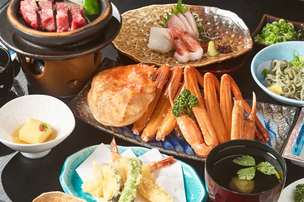 宿での夕食は、旅のクライマックス。特に但馬エリアの名物、 但馬牛や松葉ガニは、地元の誇りそのもの。赤身の旨味と脂のキレが見事に調和する但馬牛、冬の海で育まれた松葉ガニの脚肉、かに味噌の濃厚さ——。